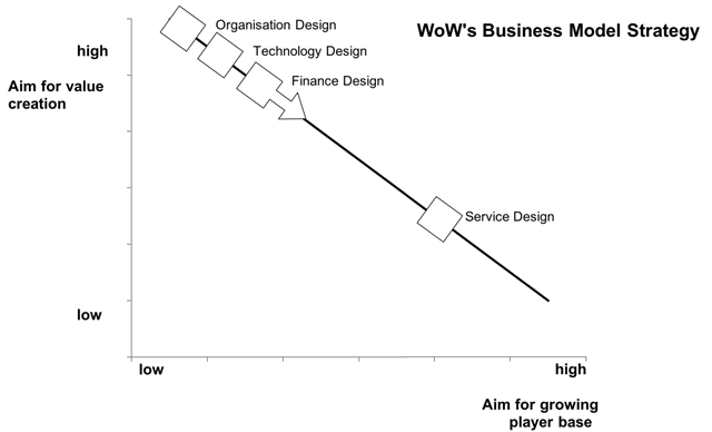 Three out of four business model parameters indicate that WoW is positioned to capture or offer the potentially highest value per player. The organisation design shows a strongly integrated value chain and the technology design is determined by high technological capabilities. However, in 2012, as a result of the pressure of declining player numbers, which disrupted the so far successful business model, WoW chose to position their financial design parameter afresh, integrating more open features like free trials and virtual-item-sales. Consequently, this parameter moved and was positioned to access a potentially larger player-base. Figure 4 illustrates how the business model parameters changed.