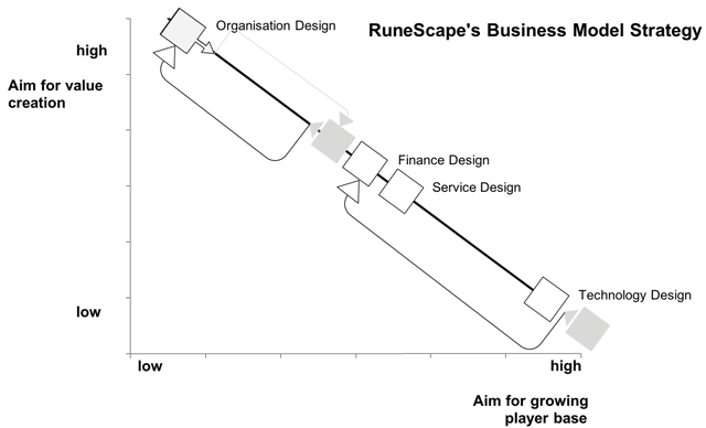 RuneScape on the other hand has been positioning its business model parameters more and more to capture and to offer a potentially higher value per player. The organisation design parameter has changed over time. Initially, the whole value chain was integrated into Jagex. After initial problems however they licenced the game to local third-party distribution platforms sharing revenue per player. As a reaction to RuneScape becoming more and more successful, these licence agreements were cancelled. On the other hand the financial design parameter was adapted after the game struggled as fewer advertisers were willing to sign with Jagex. This revised parameter was positioned to capture potentially more value per player as the financial model was changed from free-to-play to freemium (see Figure 6).
