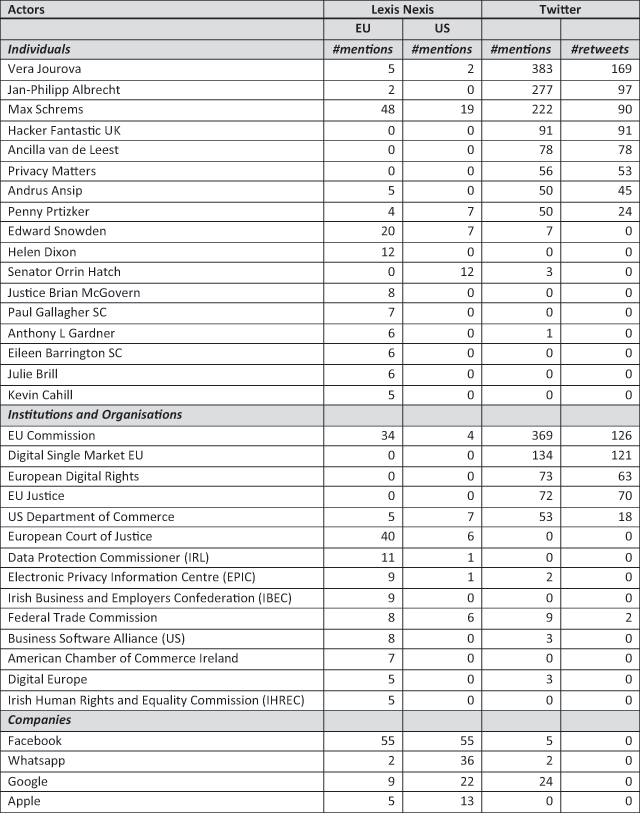 Some actors were active across both media (e.g. Vera Jourova, Max Schrems, the EU Commission, etc.) but in general there was a division between the actors deemed pertinent in each space. For example, although lawyers were identified in each medium, they were more prevalent in the newspapers articles, and although several MEPs were identified in each space, they were more prominent on Twitter (there were not many but those who were active were frequently retweeted). Core institutions were identified across both mediums but advocacy groups were more prominent on Twitter, both in number of organisations and frequency of retweets. Some key actors’ inability to transcend the Twittersphere raises questions about their ability to exert political influence beyond the realm of social media. It also raises issues regarding the ability or desire of the press to identify the importance of key actors in the online discussion which unearths potential prestige press issues.