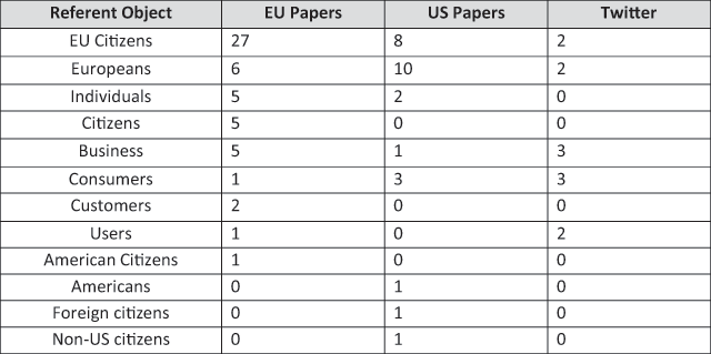 We also identified a range of referent objects, i.e. those whom the Privacy Shield is employed to aid, as depicted in Figure 2 below. EU citizens was the term used most frequently, which reflects the endeavour to provide increased data protection to personal data being transferred from the EU to the US. Somewhat surprising though is the infrequent reference to consumers or customers given the dominance of trade language in the datasets.