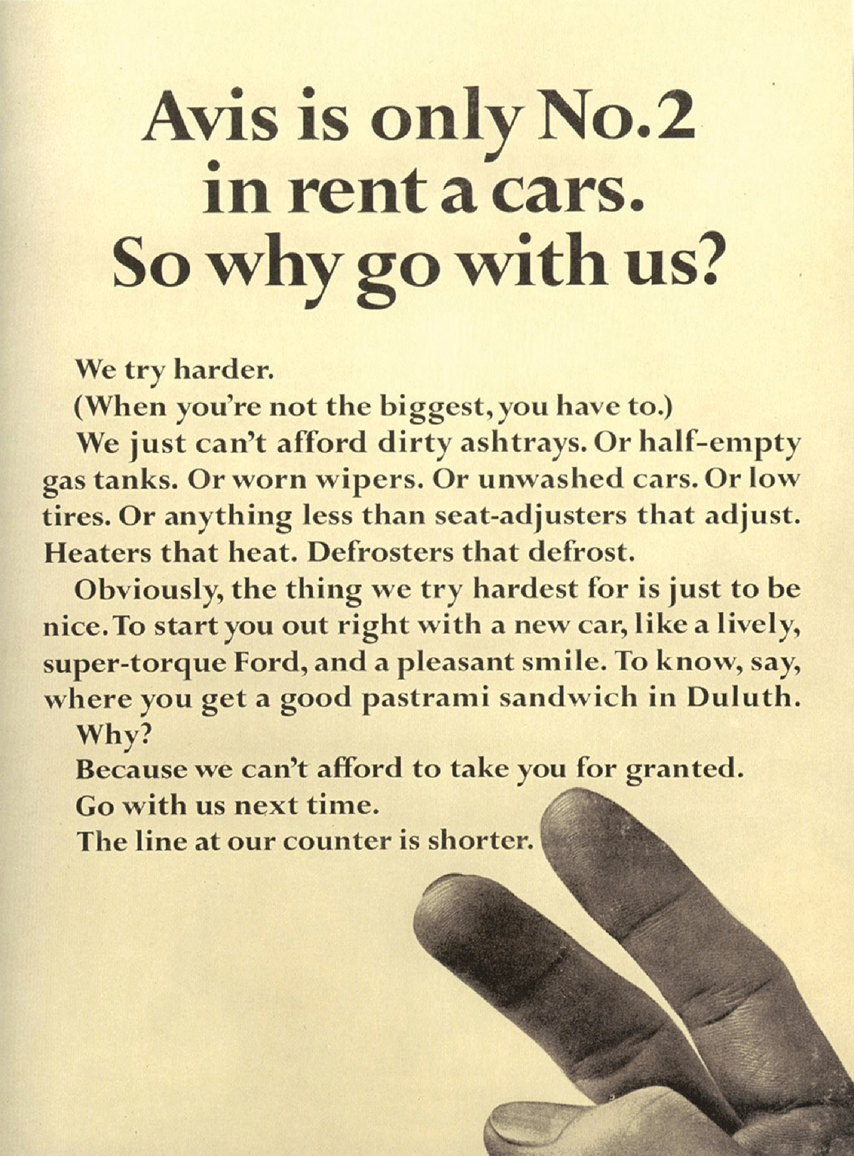 You know most people don’t understand the difference between ‘market growth’ and ‘market share.’ Market growth only the brand leader can do, vs. market share is what you have to do if you are not the brand leader, by taking share from the brand leader. You need to have a message that says I’m not the leader. Like when Bill Bernbach of DDB did with the American car rental company Avis, who were ‘number 2.’ against the market leader Hertz. If you ever want to teach anybody a case history it is the Avis against Hertz campaign. The main message was ‘Avis is only No.2 in rent a cars. So why go with us? We try harder!’ (Figure 2). Now Avis can’t say that any more as they’re both number one in the USA.