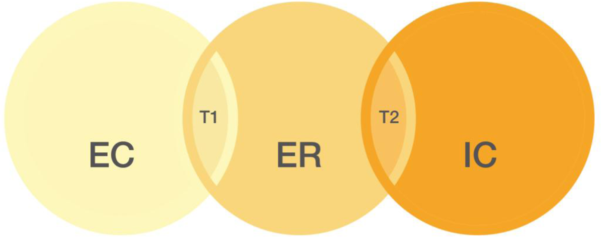 In Figure 1 below the three phases – ethnocentric (EC), ethnorelative (ER) and intercultural (IC) – as well as the transitory phase 1 between EC and ER (T1) and transitory phase 2 (T2) are depicted.