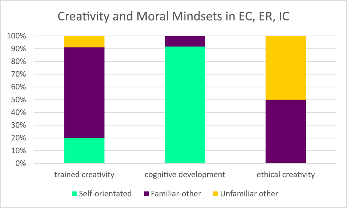 The intercultural (IC) phase is more habitually prompting responses that can be clustered as resulting from a difference-oriented moral mindset towards the ‘unfamiliar other’ (UoMS) producing dominantly ethical creative actions regarding familiar and unfamiliar cultural otherness.