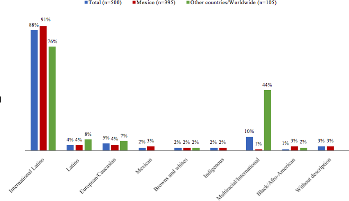 For Mexican advertising projects, only in 3% of the cases the requested phenotypes are not indicated, while almost the same percentage demand ‘European/Caucasian’, ‘Latino’ and ‘Mexican’ actors, as well as ‘indigenous’ and ‘browns and whites’. In other words, all the aforementioned profiles are in the lowest demand bracket, while the most requested profile is ‘international Latino’, especially for national advertising projects (91%) when that is compared to projects for other countries (76%).