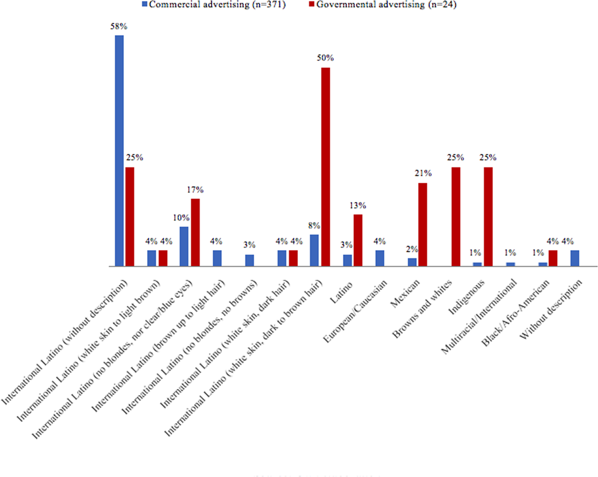 This analysis demonstrates in a very apparent manner that the selection of actors and models for advertising projects in Mexico is based explicitly on phenotyping. In the case of advertising targeted for Mexico, this phenotyping is much narrower, generally prioritizing people with ‘white’ skin tones, dark brown hair and dark eyes, denominated as ‘international Latino’. The causes of this ‘international Latino’-centrism can be explained by linking it sociohistorically with the colonial era and, particularly, with the colonial domination executed by the Iberian-European population in Mexico, which also might be the case in other post-colonial Latin American societies.