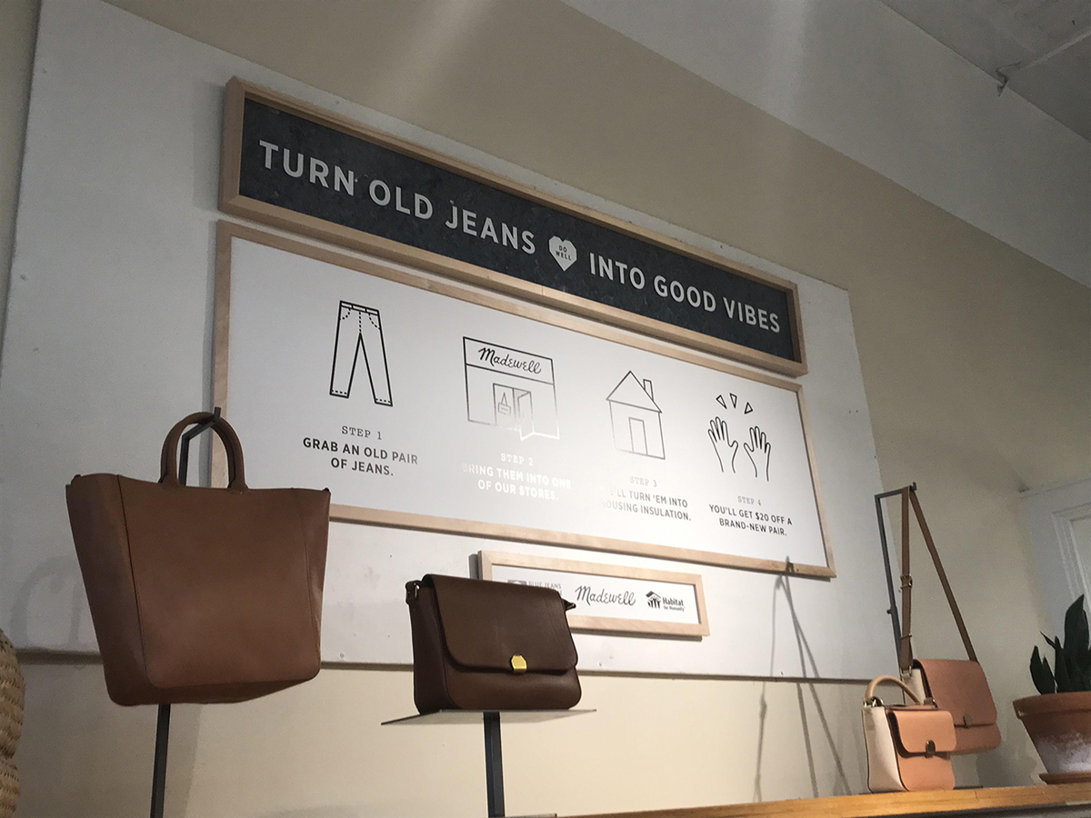 Finally, this same feeling can be seen in Madewell’s in-store signage. The promotional signage is displayed prominently in the Madewell store, on the wall directly to the left of the entrance. The sign uses the ‘Do Well’ logo and reads ‘Turn Old Jeans Into Good Vibes’, highlighting the feel-good nature of recycling. The black-and-white graphic that is also included on the website is framed below the wording, as are the Blue Jeans Go Green logo, Madewell’s logo, and the logo for ‘Habitat for Humanity’, which is one of the groups that receives insulation from the company’s efforts. Again, this promotion rests on social and environmental benefits as well as on the financial benefit for the consumer.