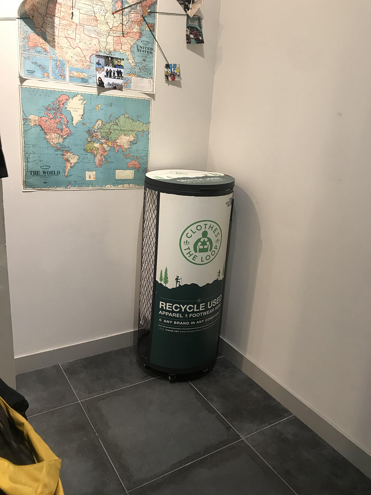 Compared to both H&M and Madewell, the recycling bin and in-store signage at The North Face location is less prominent; the bin is located near the front of the store, but around the corner from the main entryway. Without looking for it, a consumer would be unlikely to see it. The circular bin has the large Clothes the Loop logo and similar imagery from the website. The large lettering reading ‘Recycle Used Apparel & Footwear Here,’ again focuses on the used aspects from the donations rather than the monetary incentive to buy more products. In fact, the bin does not indicate the financial incentive at all, rather it points customers to find more information on the website mentioned above. At the same time, the smaller wording expresses that it is an ‘innovative program,’ but there is no specific justification for that. However, even on The North Face’s website there is little explanation of what is ‘innovative’ about the programme.